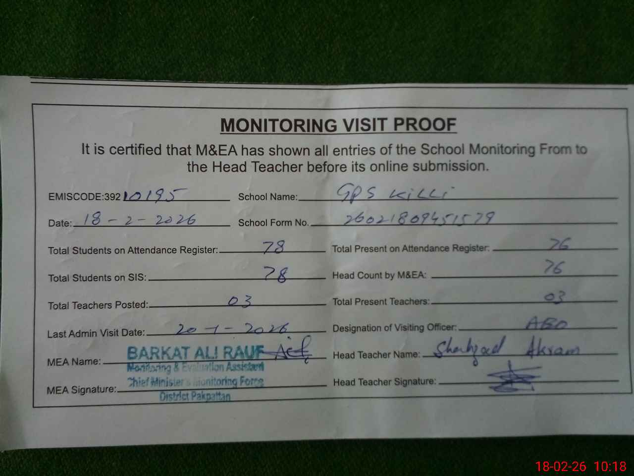 | EMIS Code: 39210195 | Name of School: GPS KILLI PO PAKPATTAN | |||
