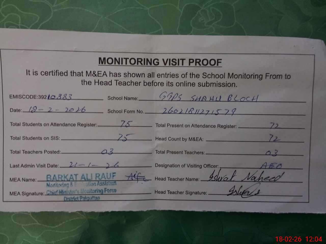 | Attendance Register | Head Teacher | MEA with School | Visit Proof |