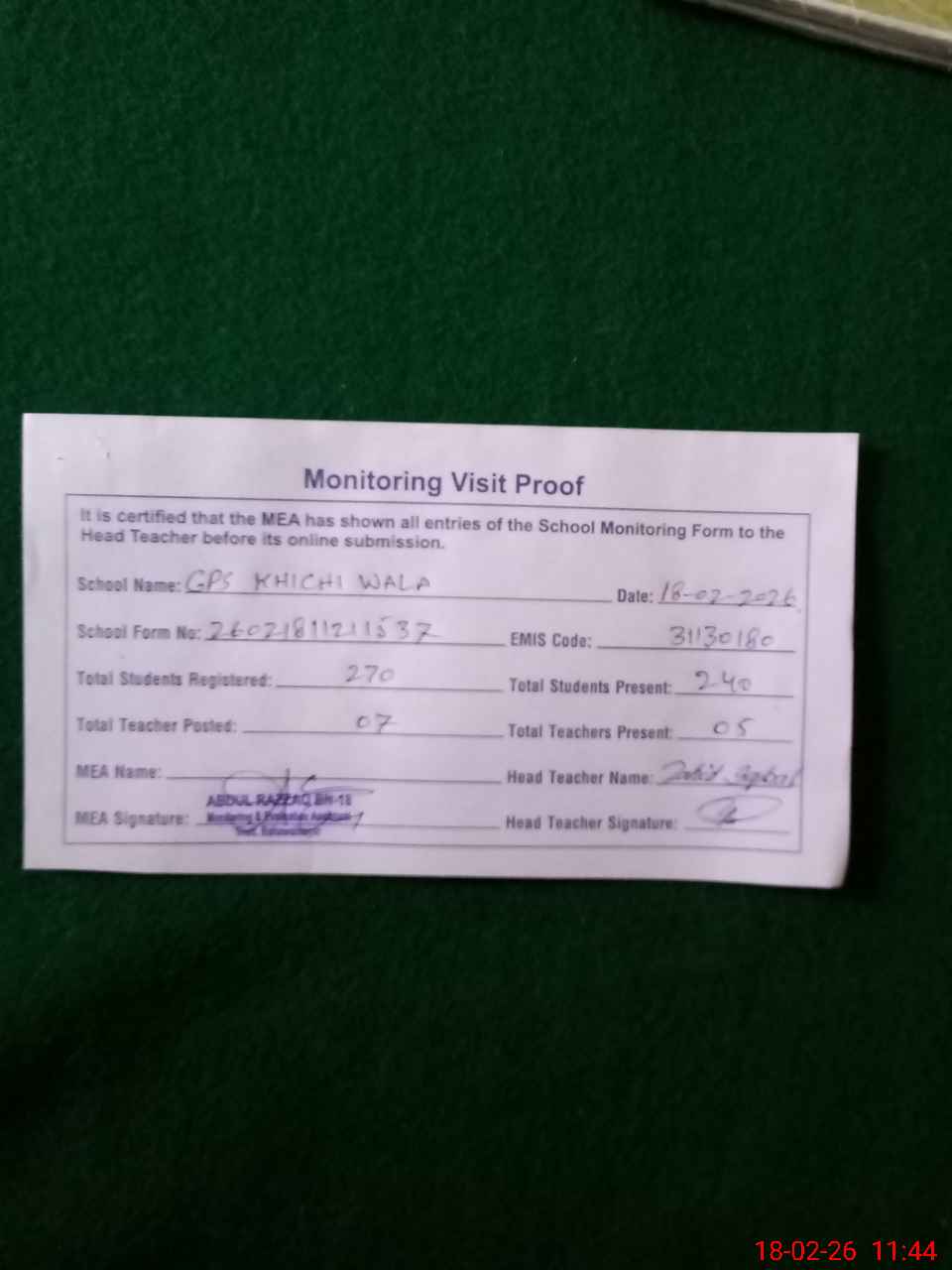 | Certified that this School was Inspected by the Undersigned MEA/DMO Today and the Information Stated Above is as Per Record. | |||||