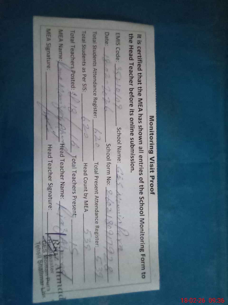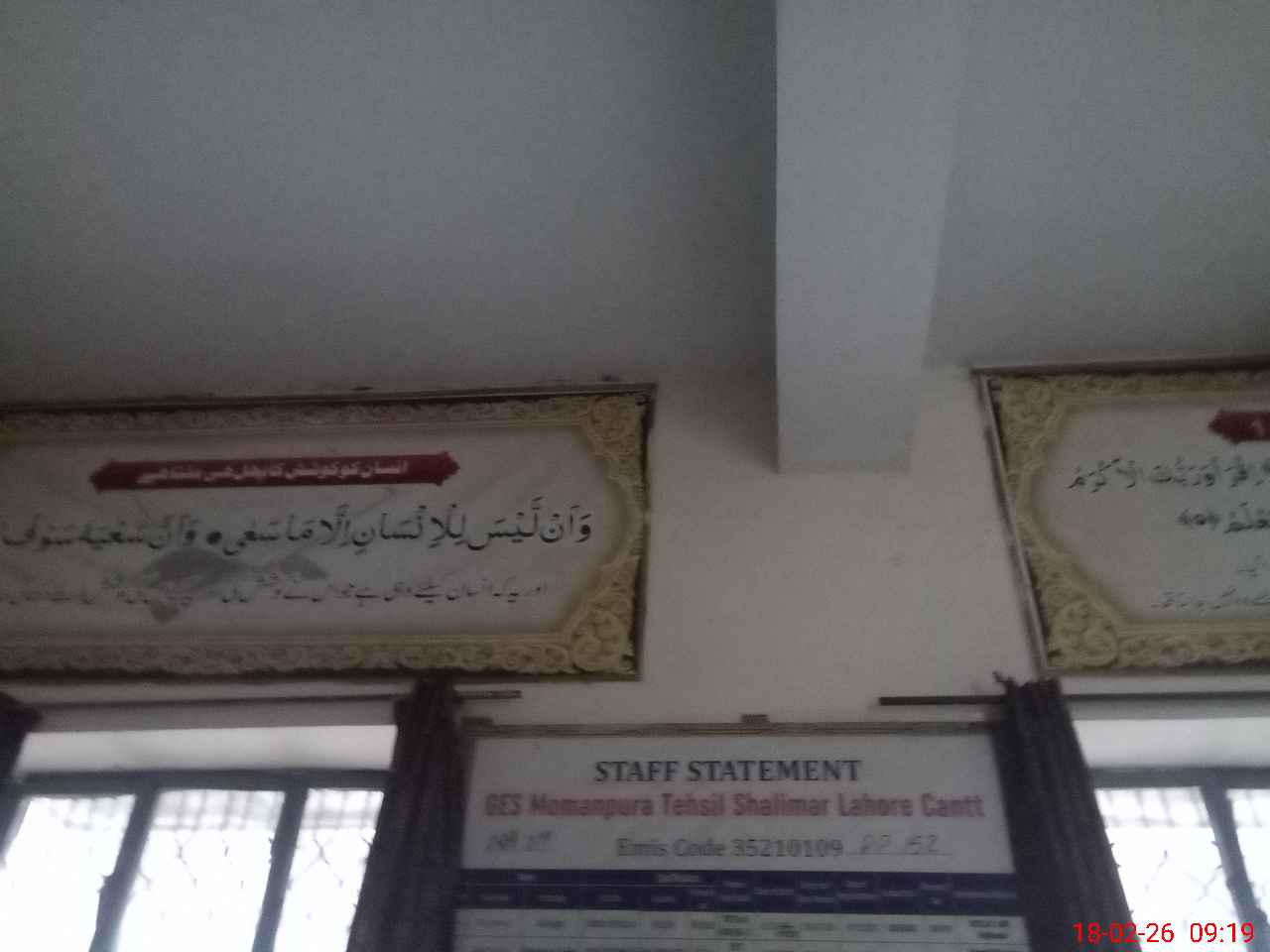 | EMIS Code: 35210109 | Name of School: GES MOMAN PURA GT ROAD, TEHSIL SHALIMAR | |||