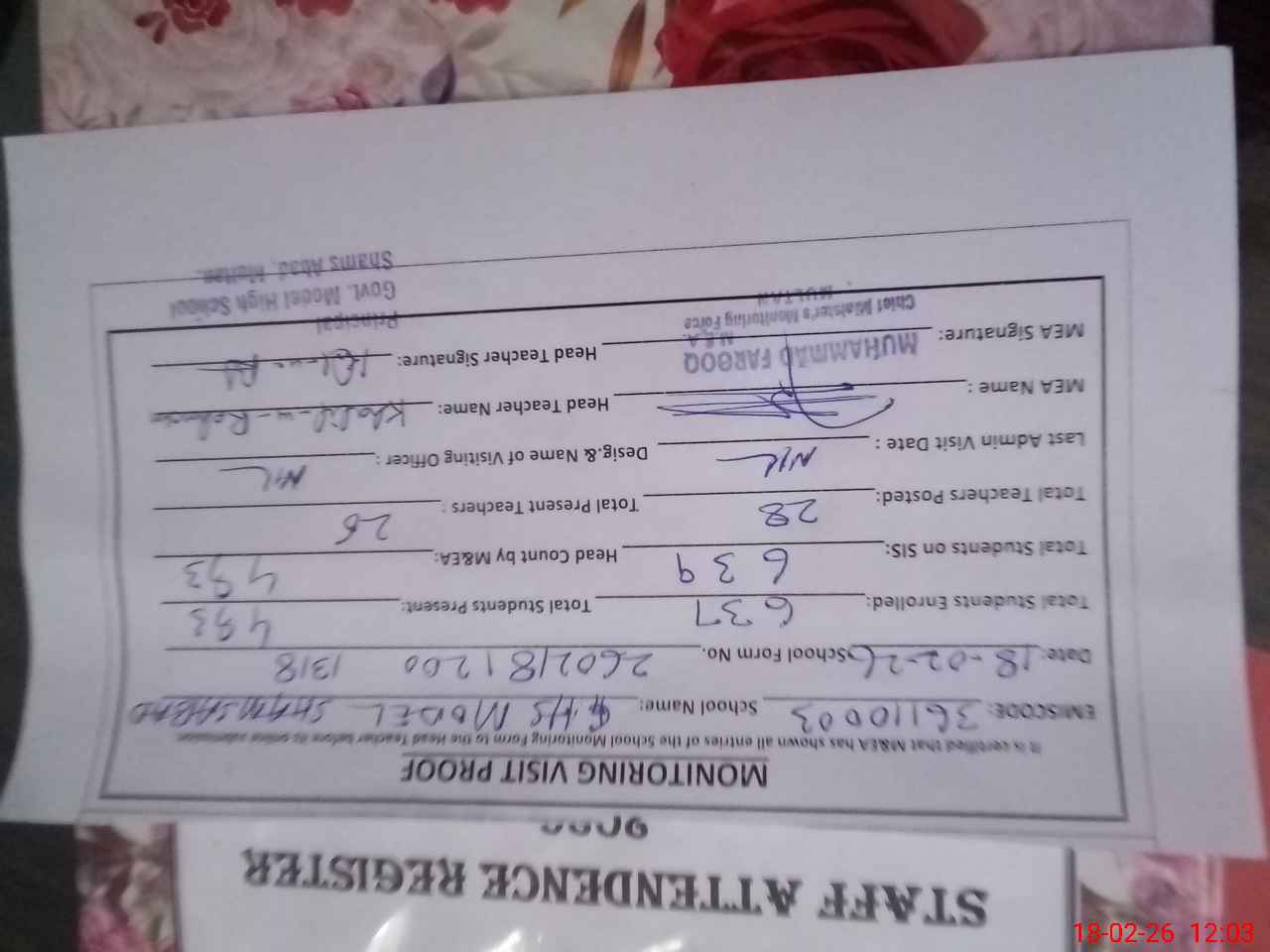 | Attendance Register | Head Teacher | MEA with School | Visit Proof |