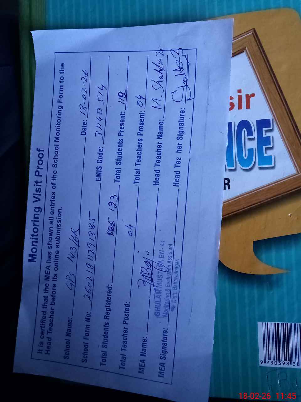 | Attendance Register | Head Teacher | MEA with School | Visit Proof |