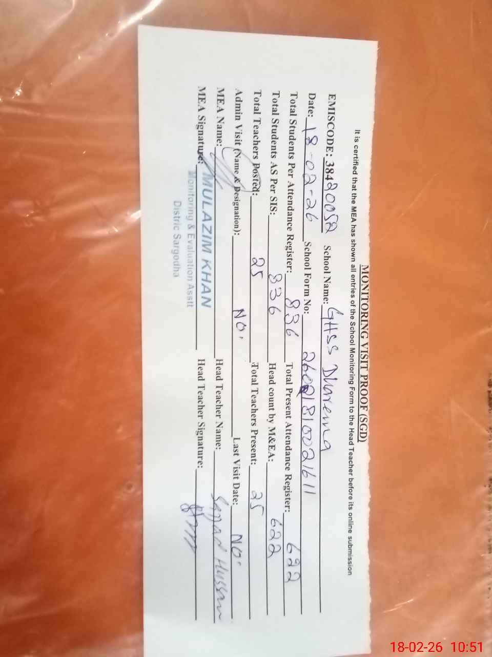 | Attendance Register | Head Teacher | MEA with School | Visit Proof |