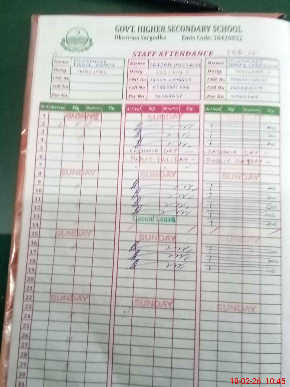 | CNIC | Full Name | Designation | R/C | Absence during last cal. month |