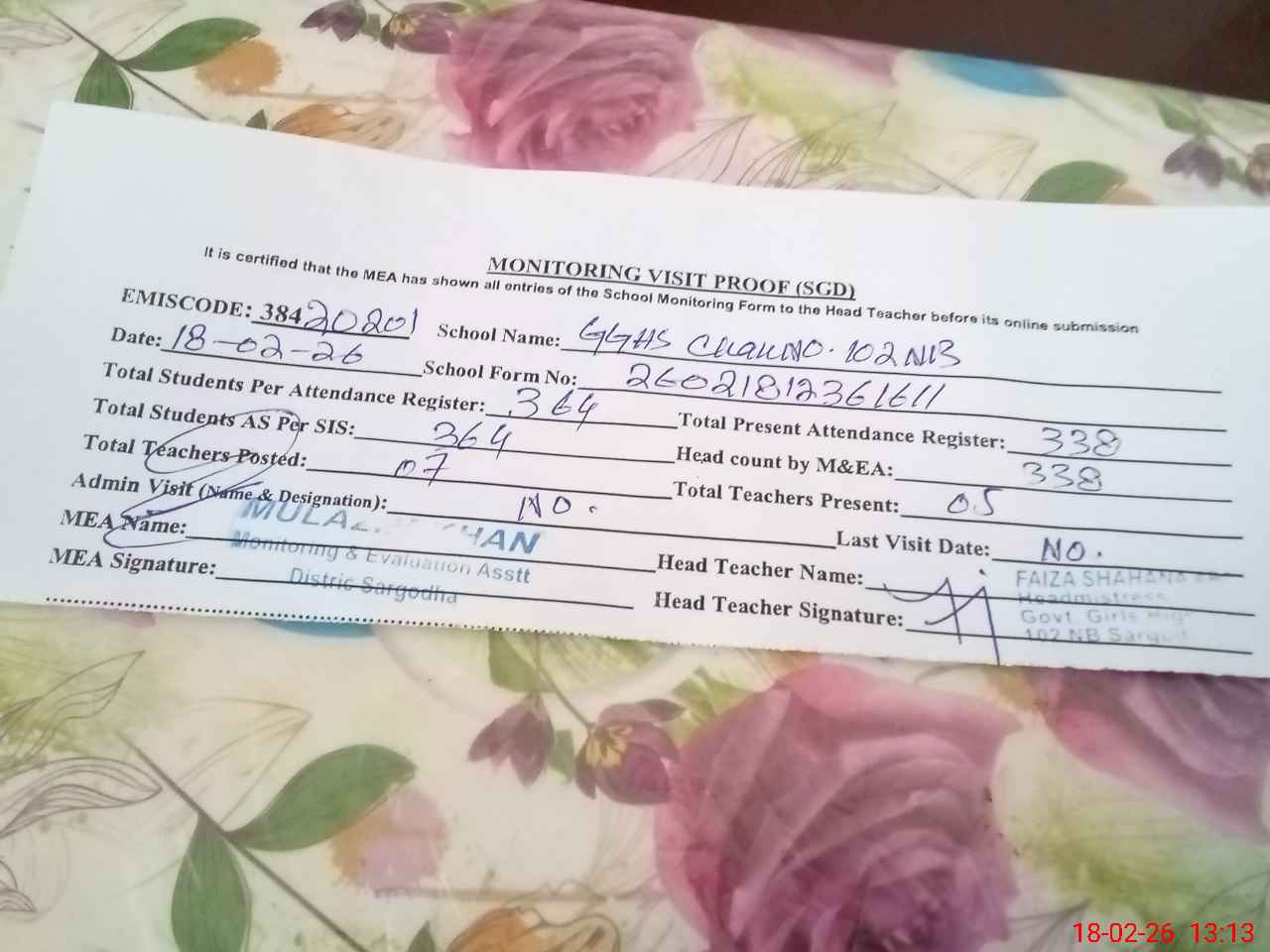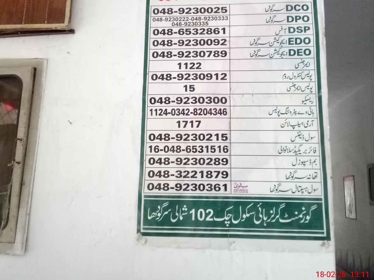 | EMIS Code: 38420201 | Name of School: GGHS CHAK NO.102 NB SARGODHA | |||
