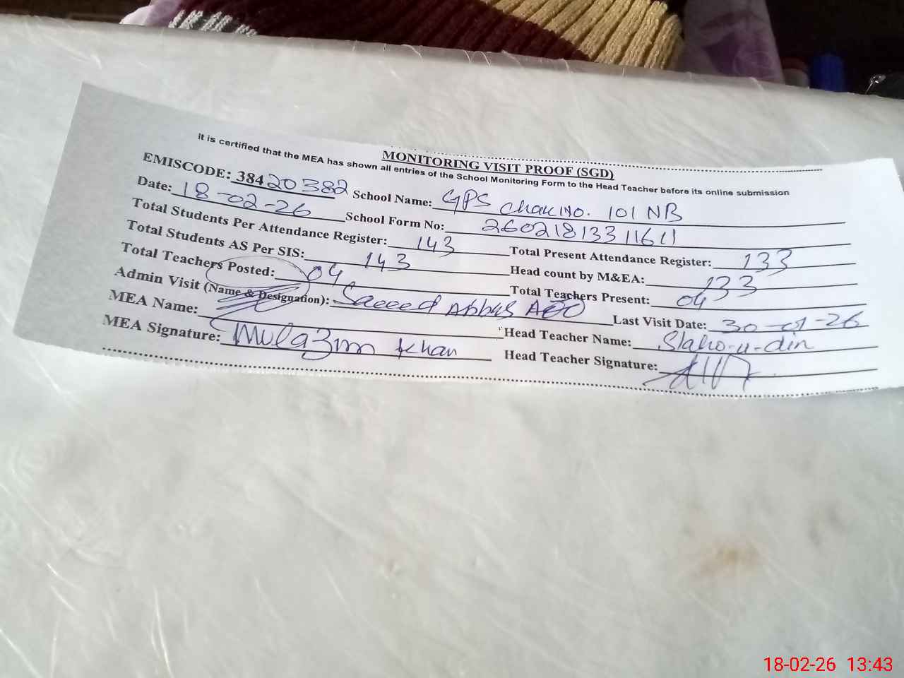 | Attendance Register | Head Teacher | MEA with School | Visit Proof |
