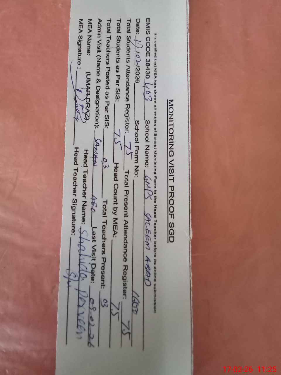 | Attendance Register | Head Teacher | MEA with School | Visit Proof |