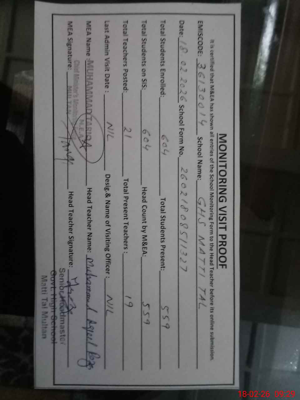 | EMIS Code: 36130014 | Name of School: GHS MATTI TAL P/O JAL WALA MULTAN | |||