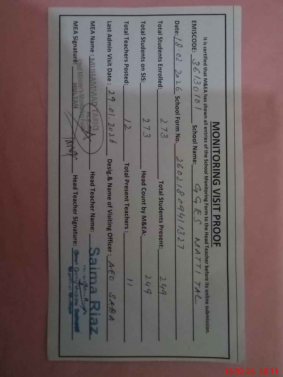 | EMIS Code: 36130101 | Name of School: GGES MATTI TAL MULTAN | |||