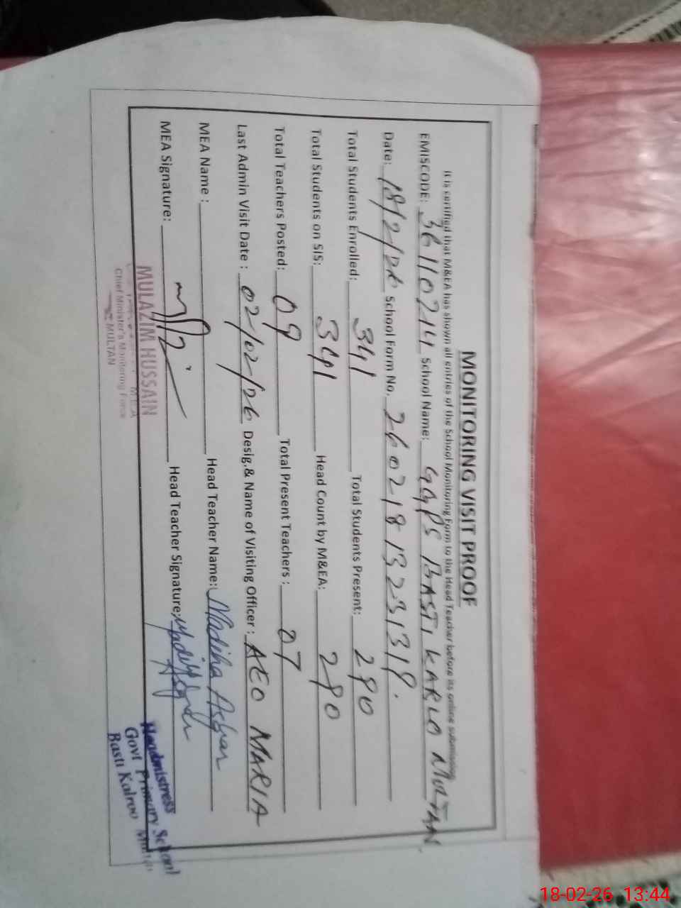 | EMIS Code: 36110214 | Name of School: GGPS BASTI KALRO MULTAN | |||