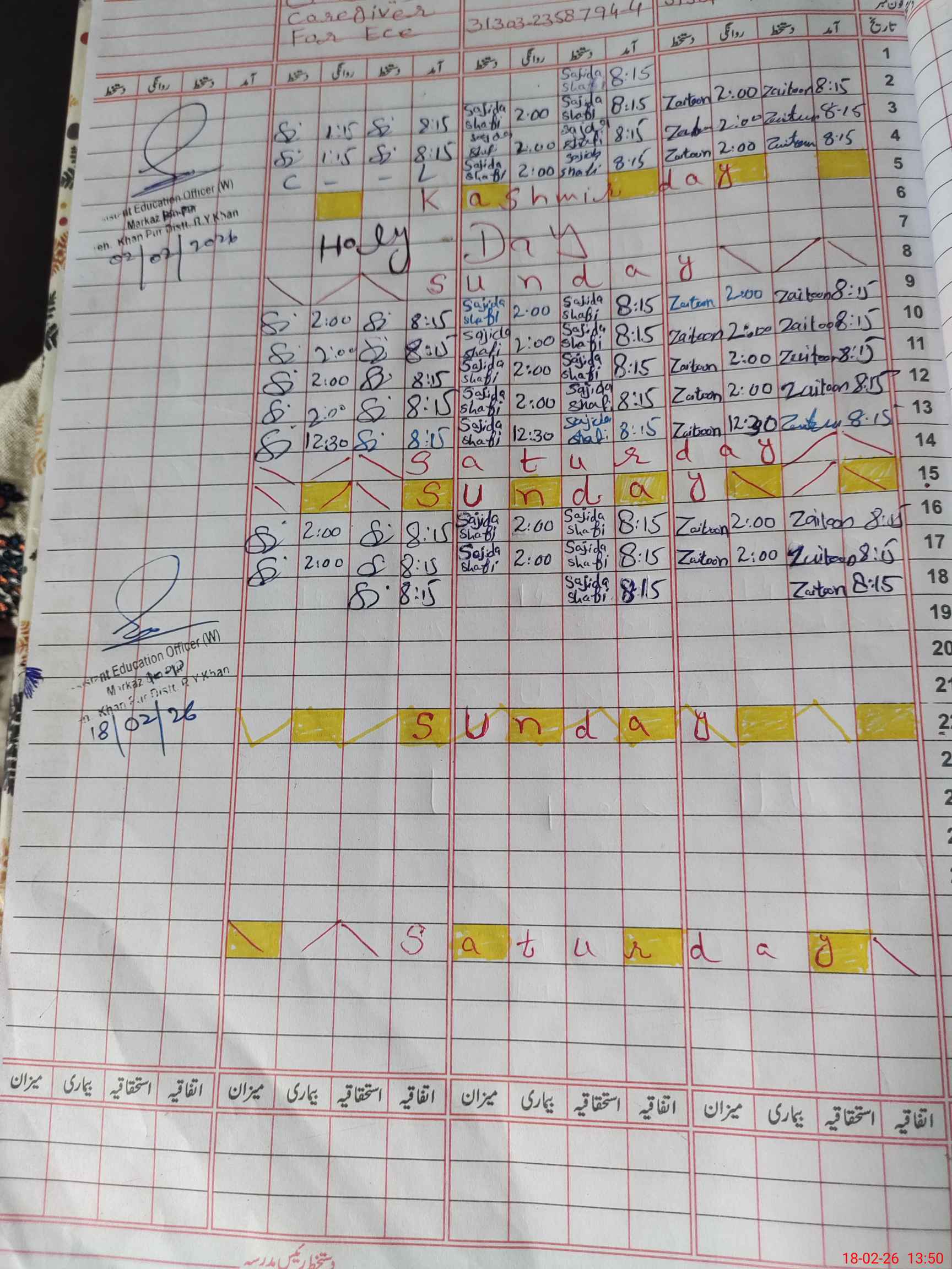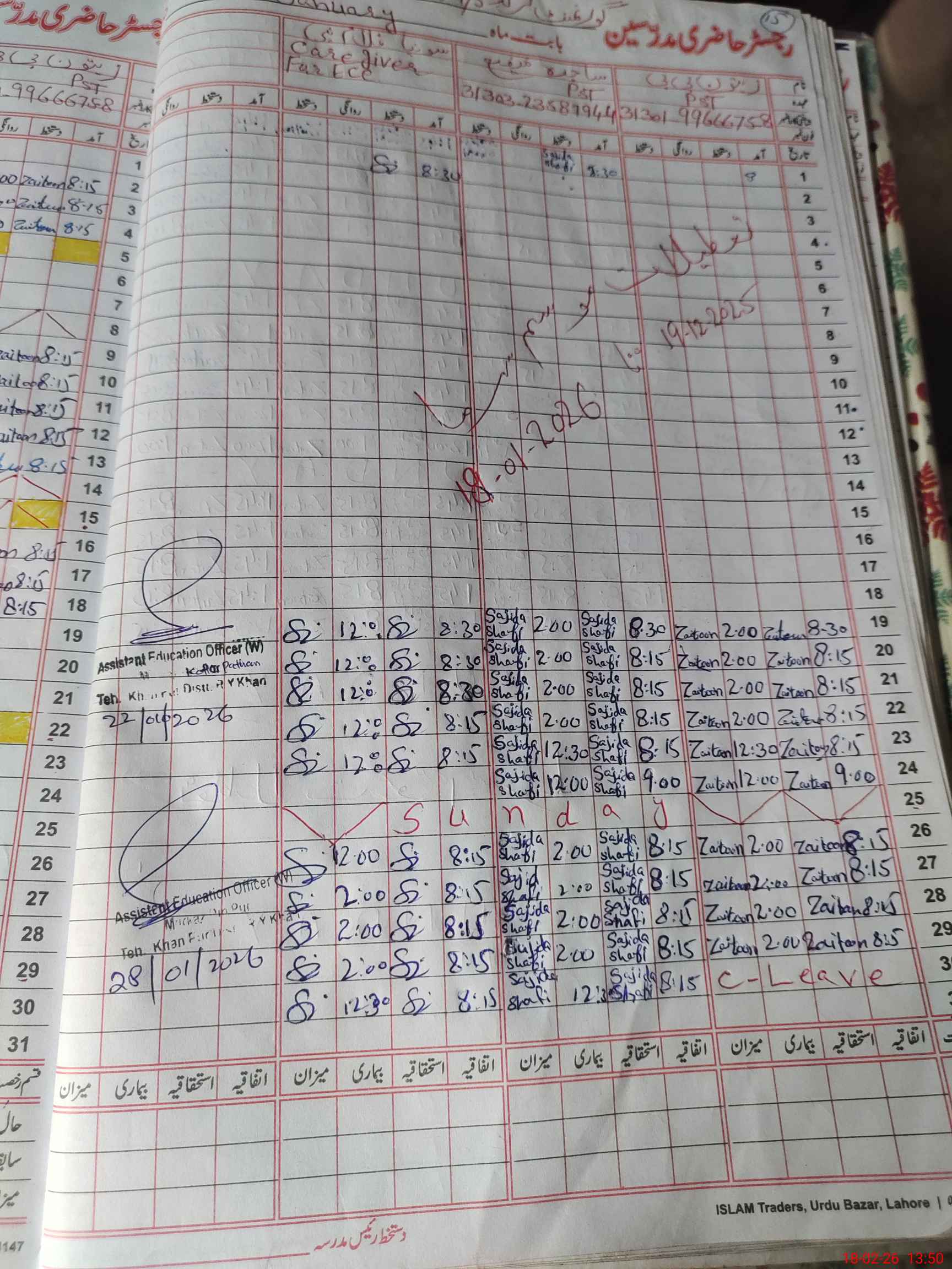 | CNIC | Full Name | Designation | R/C | Absence During Last Calender Month |