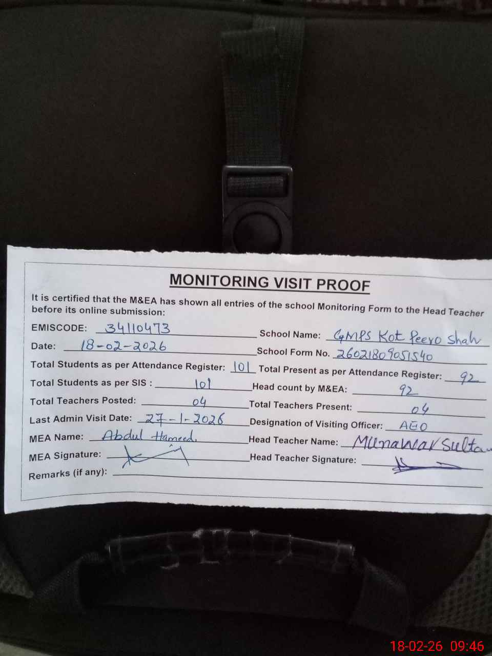 | Attendance Register | Head Teacher | MEA with School | Visit Proof |