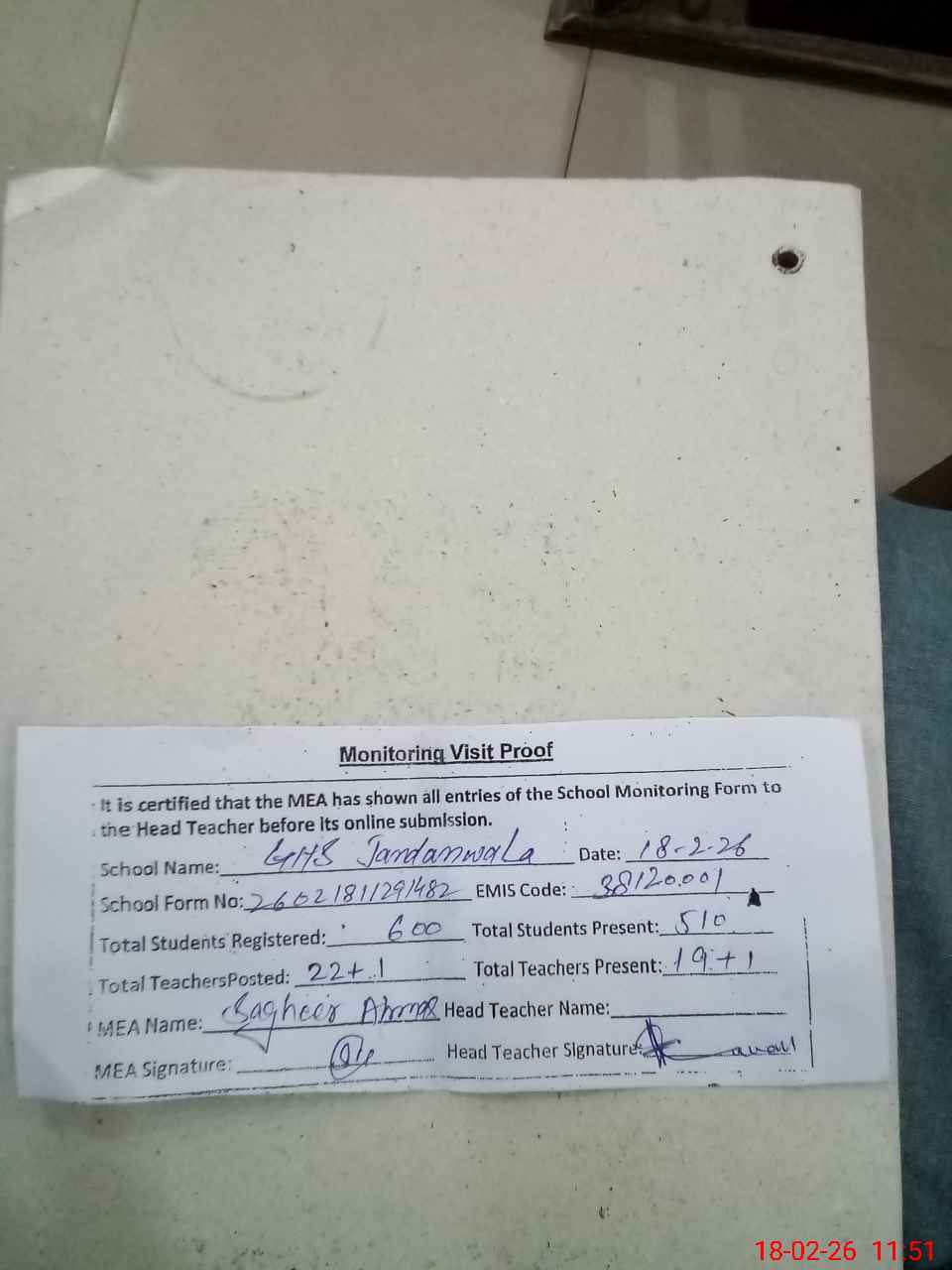 | Attendance Register | Head Teacher | MEA with School | Visit Proof |