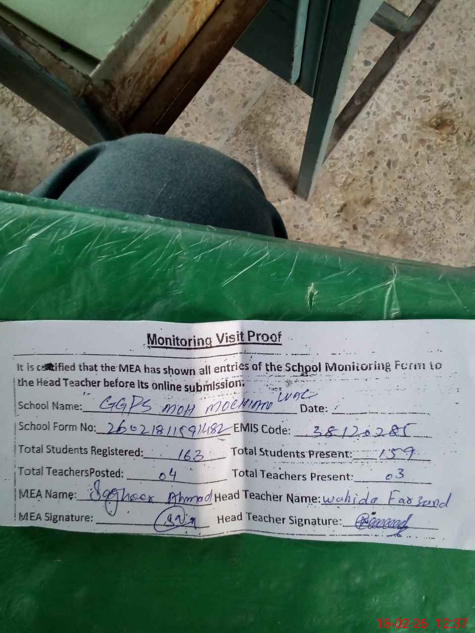 | Attendance Register | Head Teacher | MEA with School | Visit Proof |
