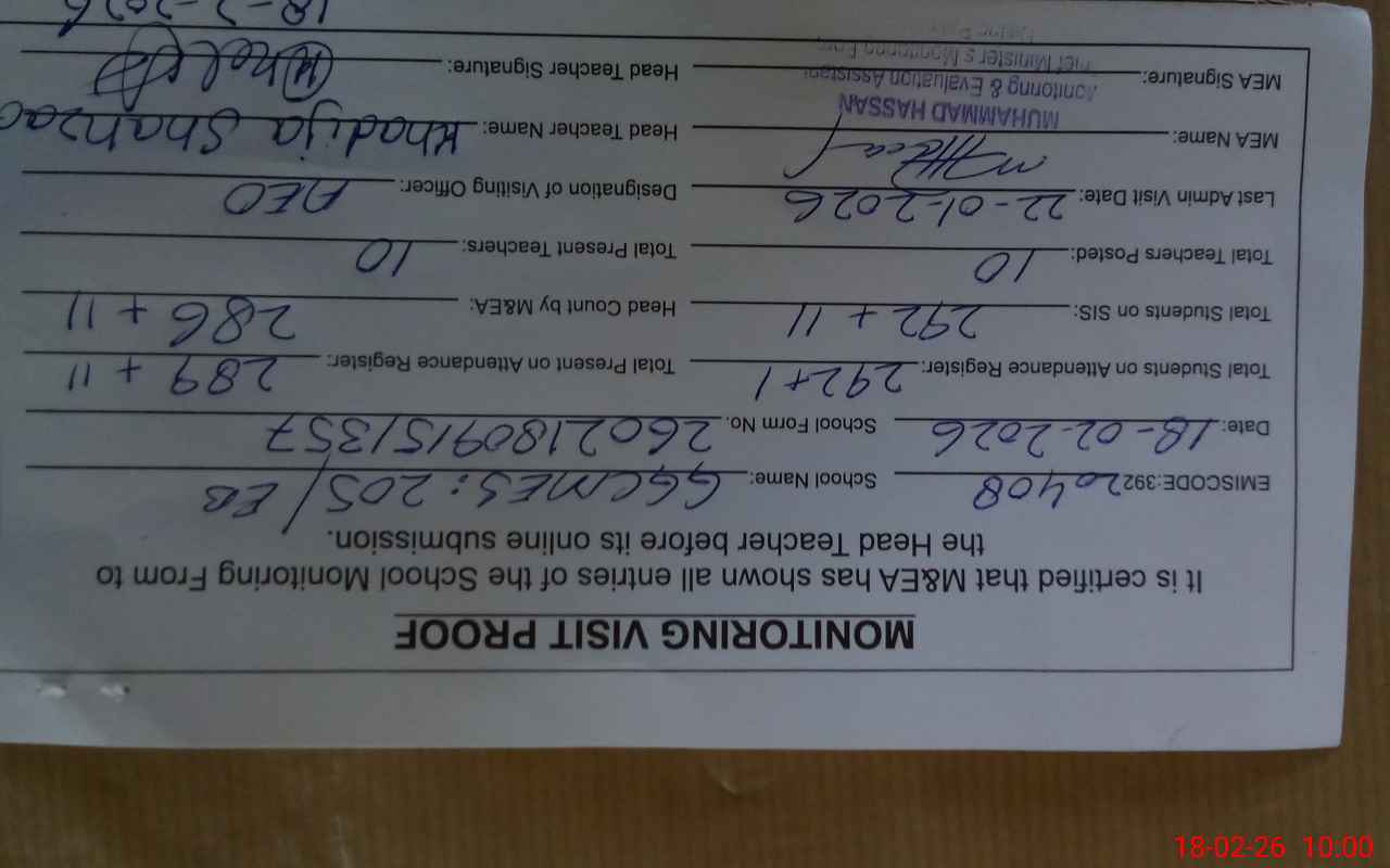 | Certified that this School was Inspected by the Undersigned MEA/DMO Today and the Information Stated Above is as Per Record. | |||||