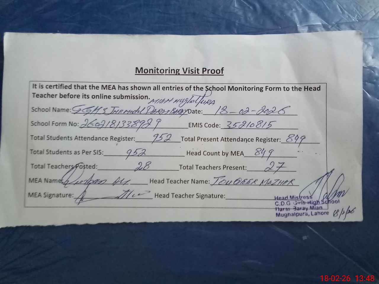 | Attendance Register | Head Teacher | MEA with School | Visit Proof |