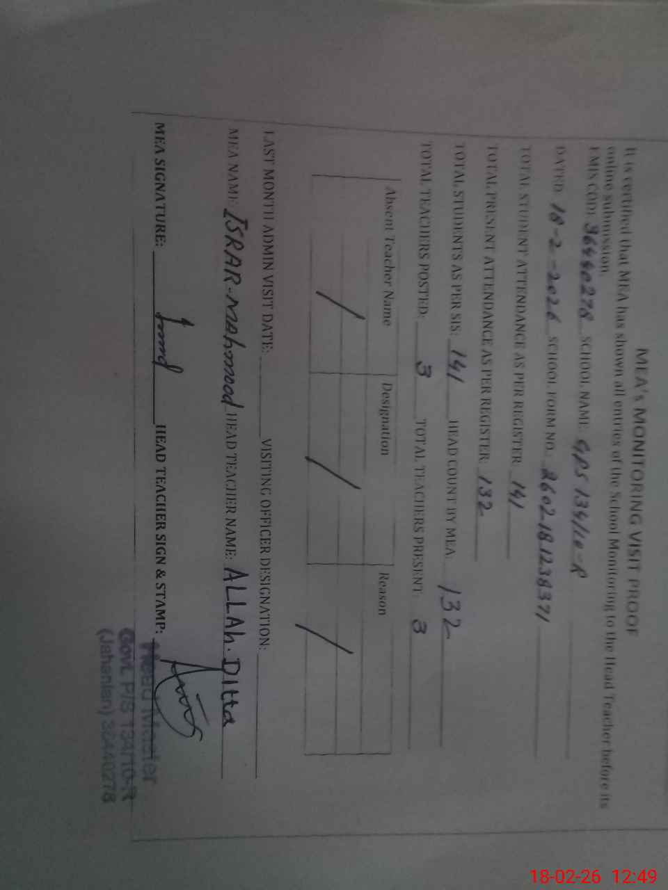 | Attendance Register | Head Teacher | MEA with School | Visit Proof |