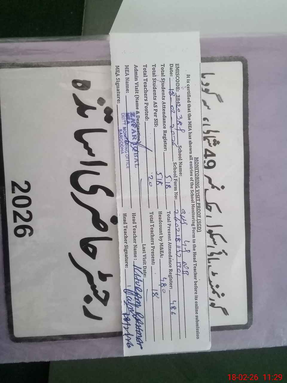 | Attendance Register | Head Teacher | MEA with School | Visit Proof |