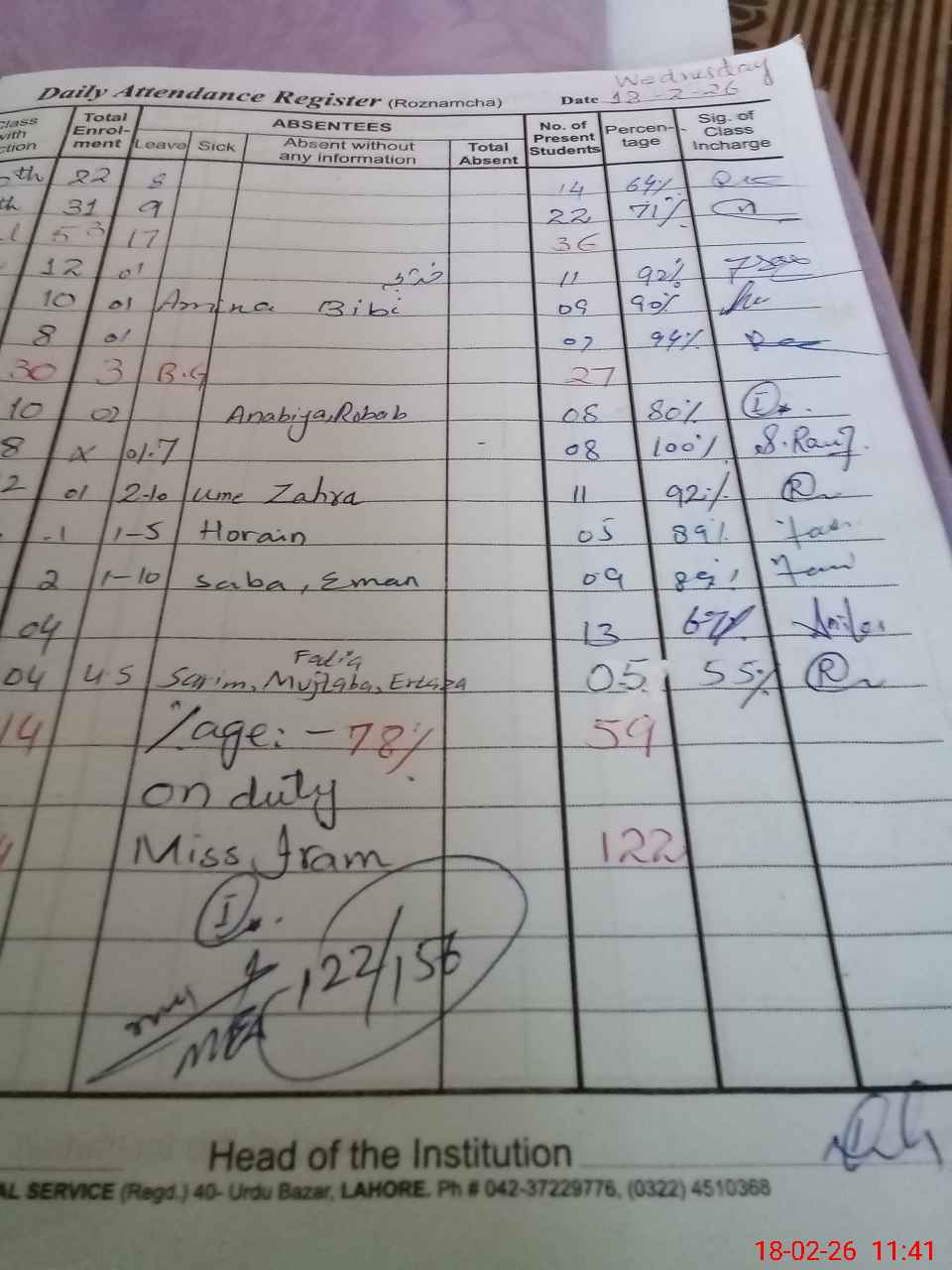 | Total Students Present | 0 | 5 | 9 | 5 | 11 | 8 | 8 | 7 | 9 | 11 | 22 | 14 | 122 | |||