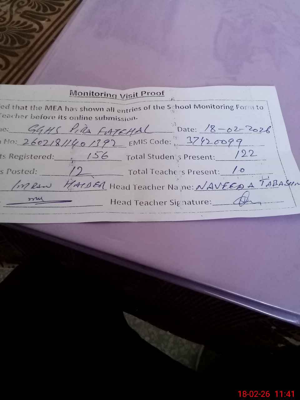 | Attendance Register | Head Teacher | MEA with School | Visit Proof |