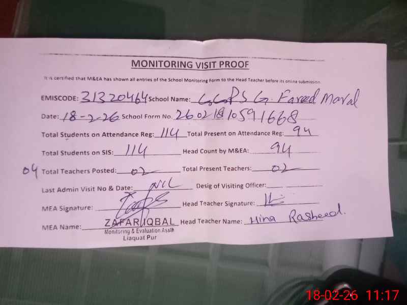 | EMIS Code: 31320464 | Name of School: GGPS GHULAM FAREED MARAL | |||