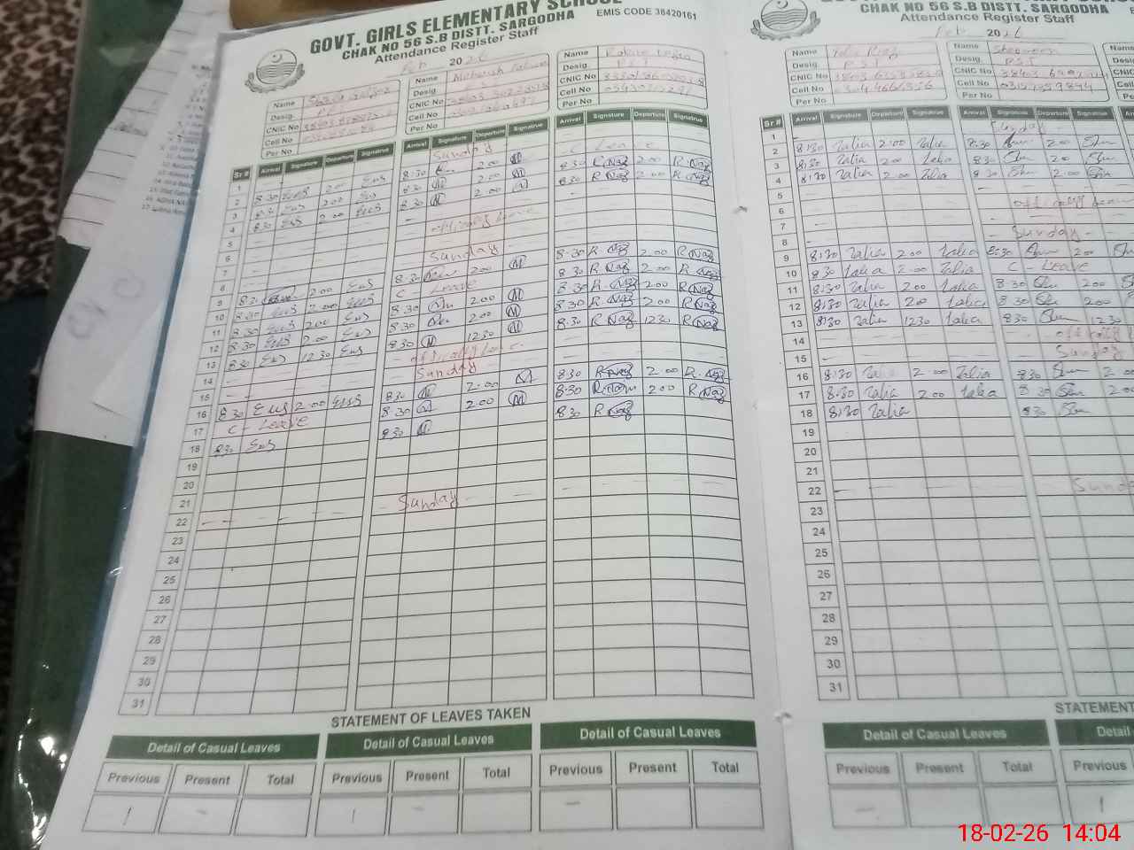 | CNIC | Full Name | Designation | R/C | Absence During Last Calender Month |