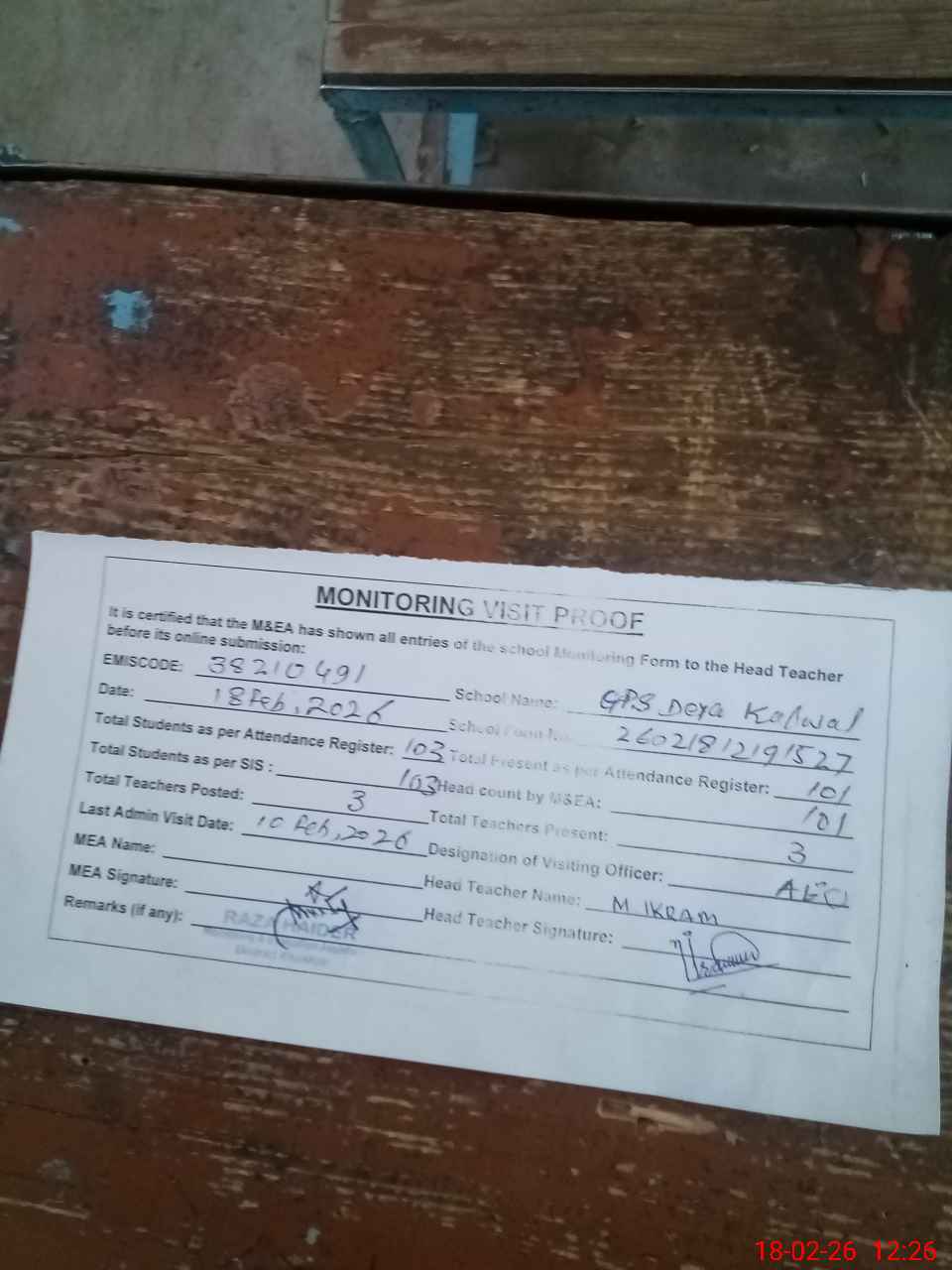 | Attendance Register | Head Teacher | MEA with School | Visit Proof |