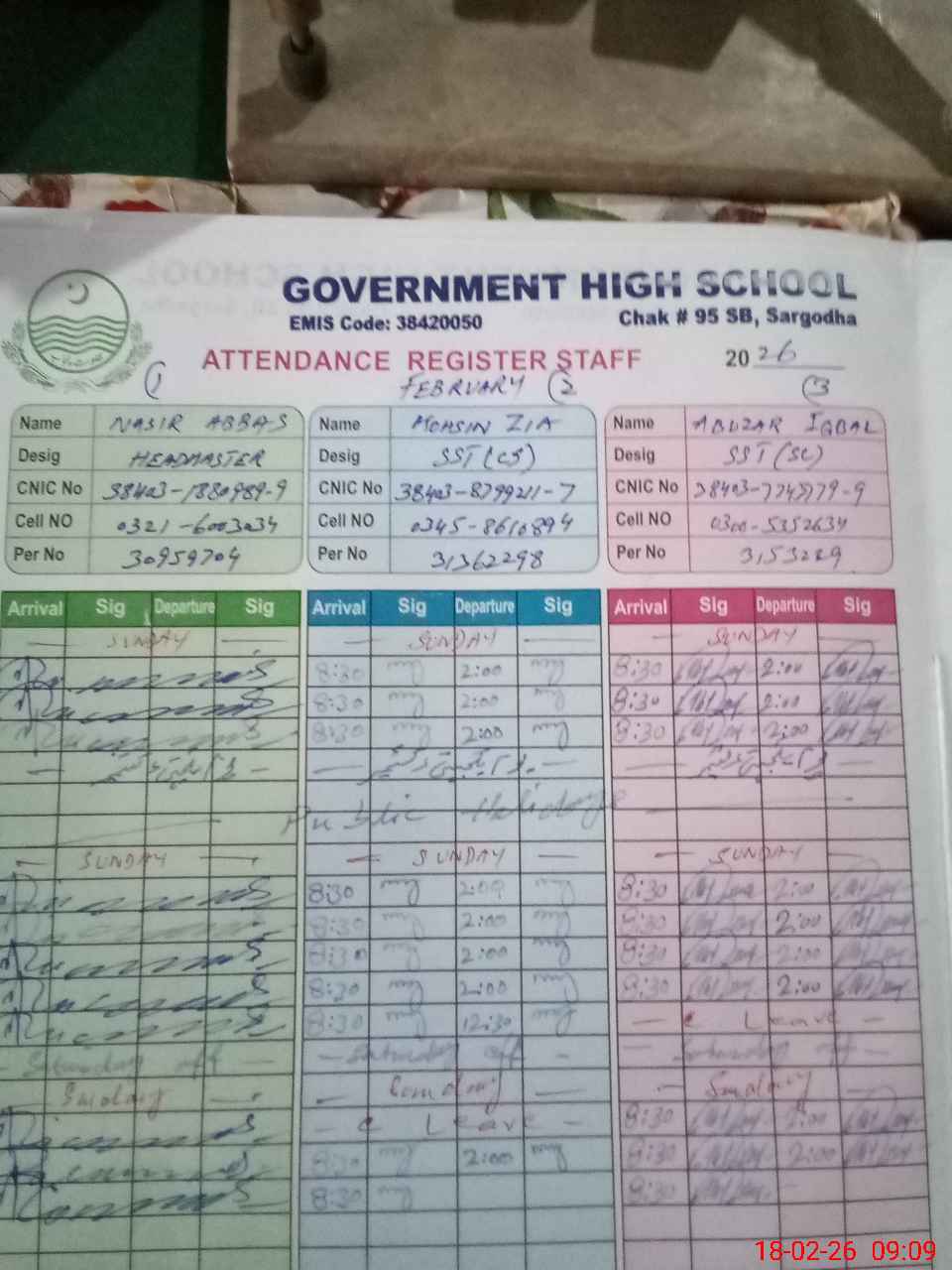 | CNIC | Full Name | Designation | R/C | Absence during last cal. month |