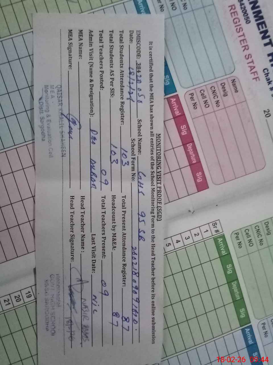| Attendance Register | Head Teacher | MEA with School | Visit Proof |