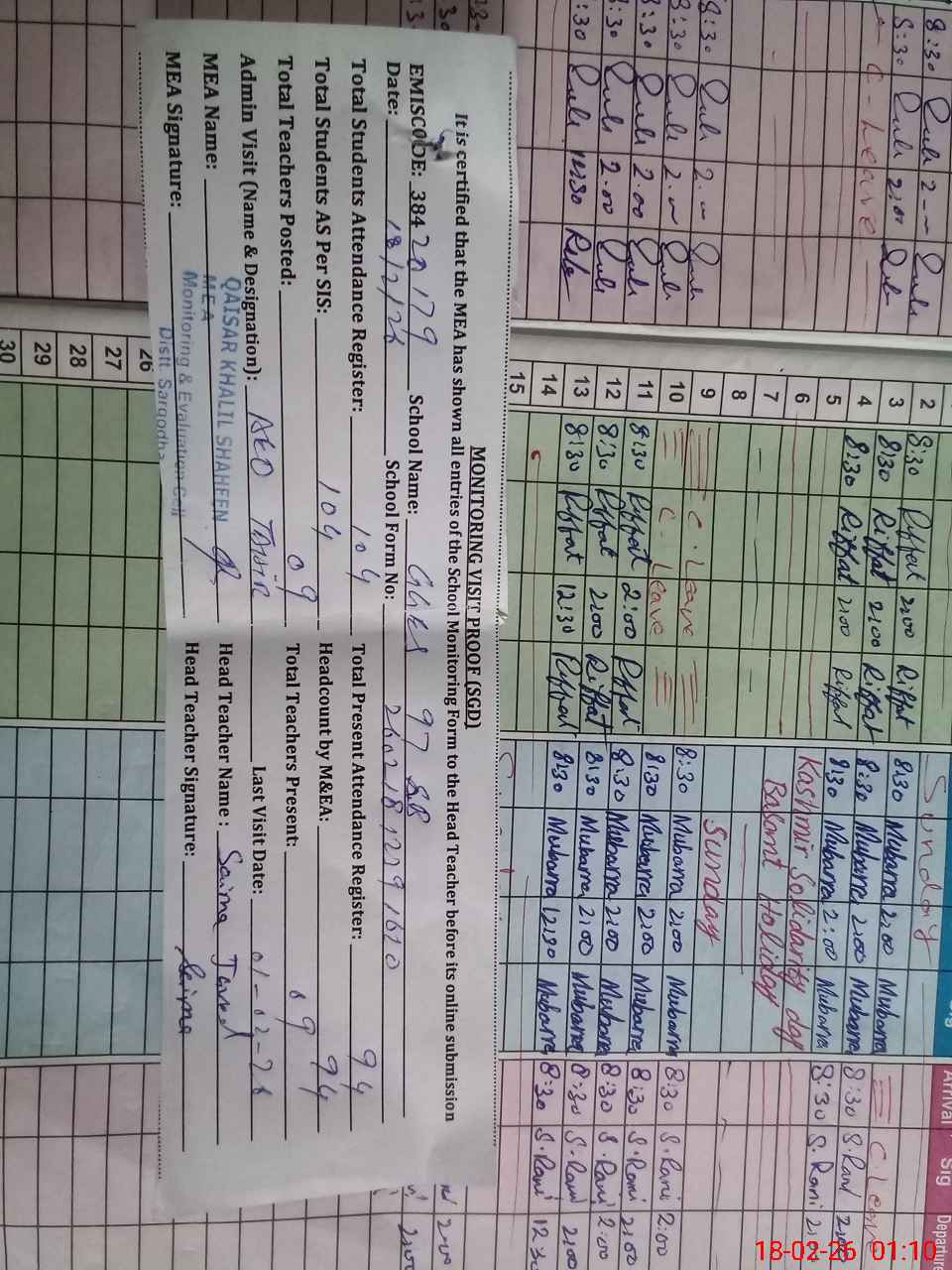 | Attendance Register | Head Teacher | MEA with School | Visit Proof |