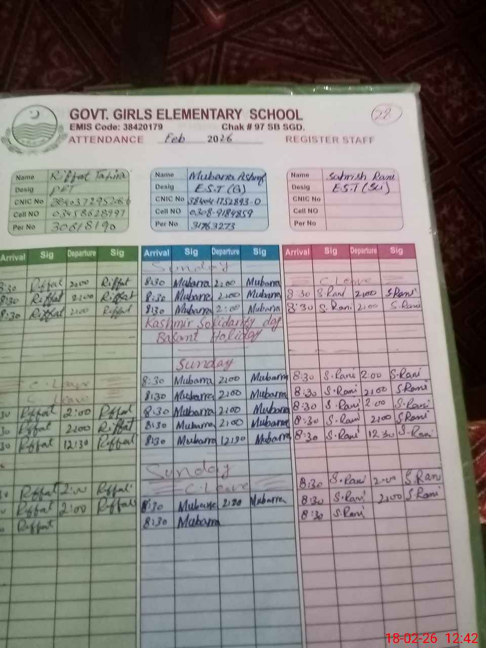 | CNIC | Full Name | Designation | R/C | Absence During Last Calender Month |