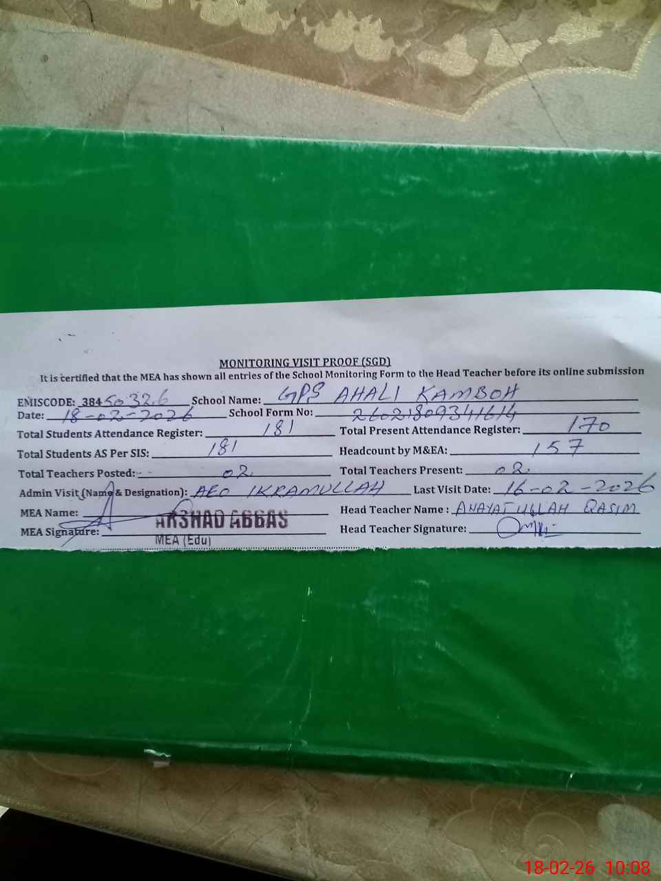 | Attendance Register | Head Teacher | MEA with School | Visit Proof |