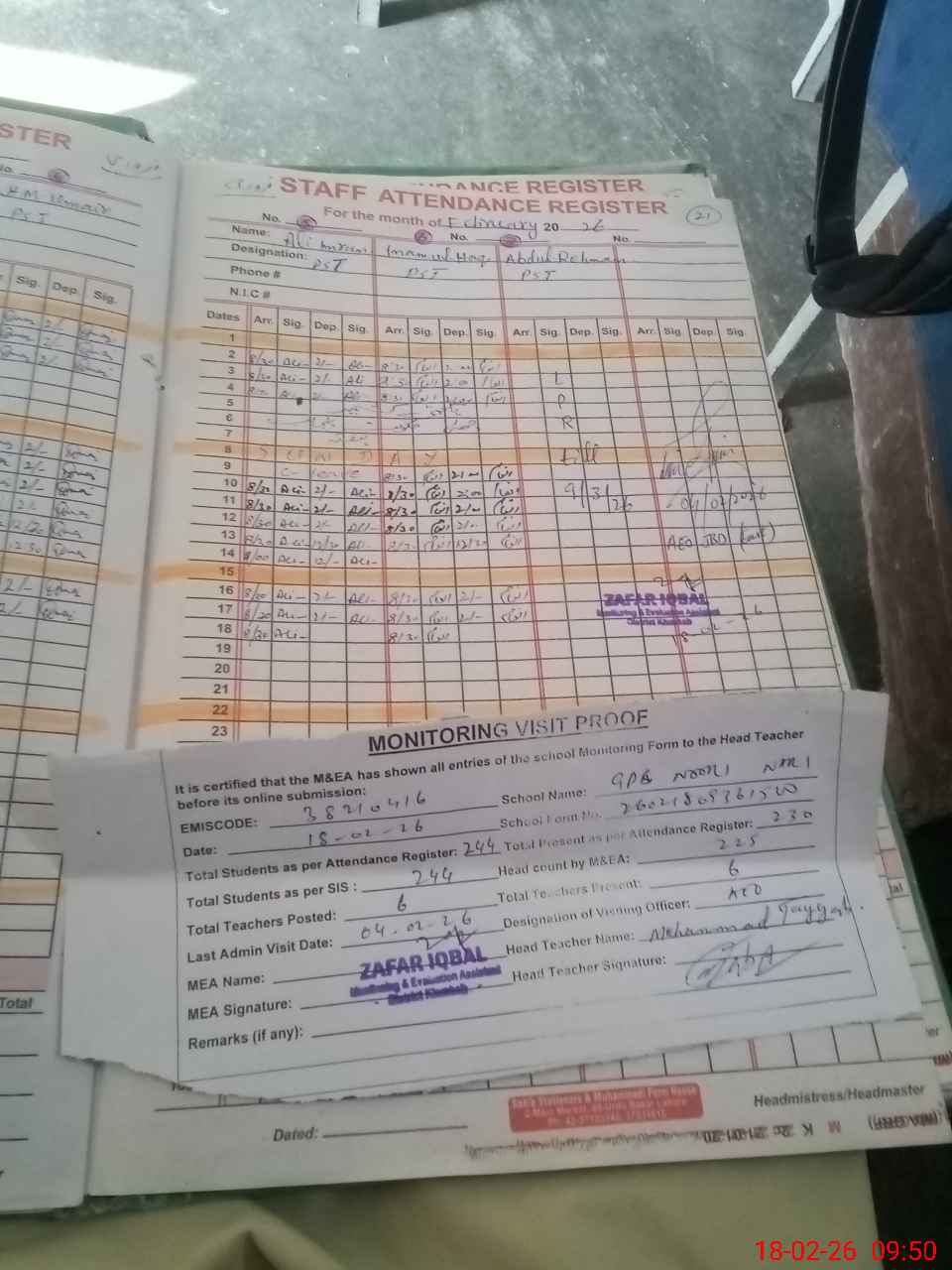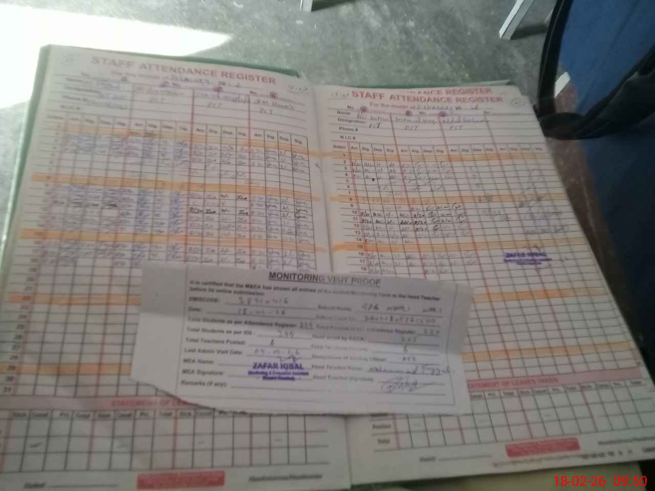 | Attendance Register | Head Teacher | MEA with School | Visit Proof |