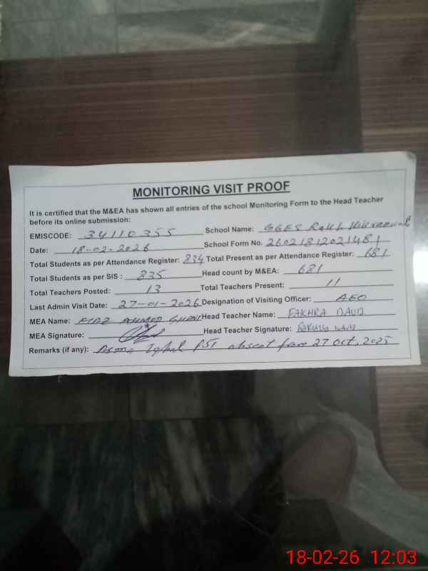 | Remarks (Use Separate Page if Required): Attendance of teaching staff and students on SIS Software is not updated Asma Iqbal PST absent from her duty w e f 27 Oct, 2025 Data as per provided by School Staff and found during physical visit | |||||