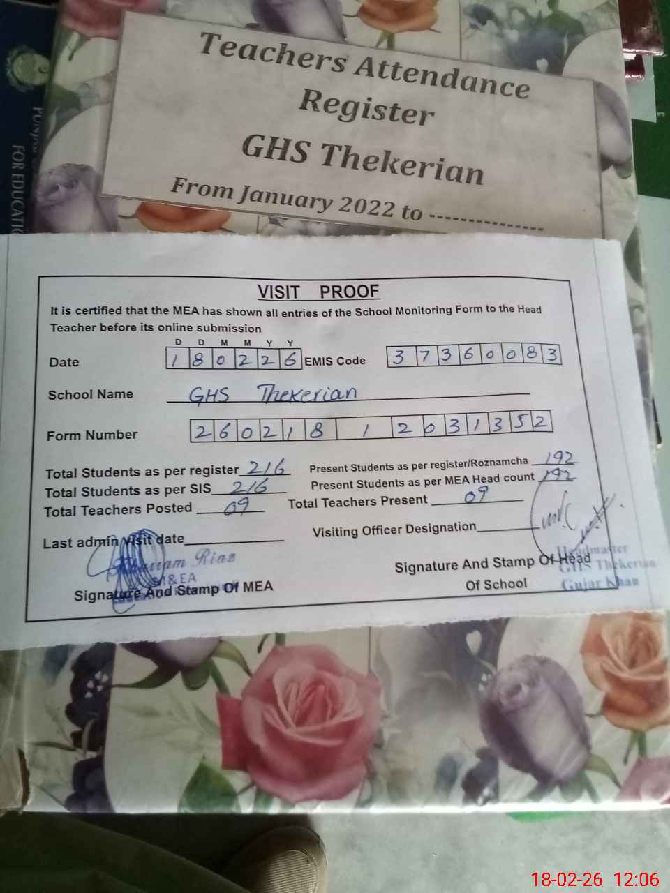 | Attendance Register | Head Teacher | MEA with School | Visit Proof |
