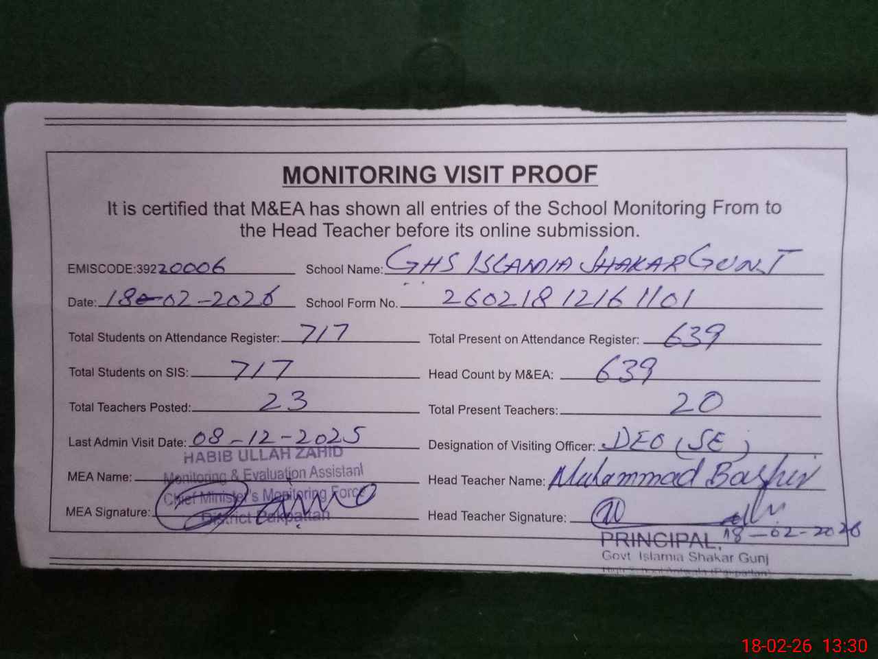 | EMIS Code: 39220006 | Name of School: GHS ISLAMIA SHAKARGUNJ | |||