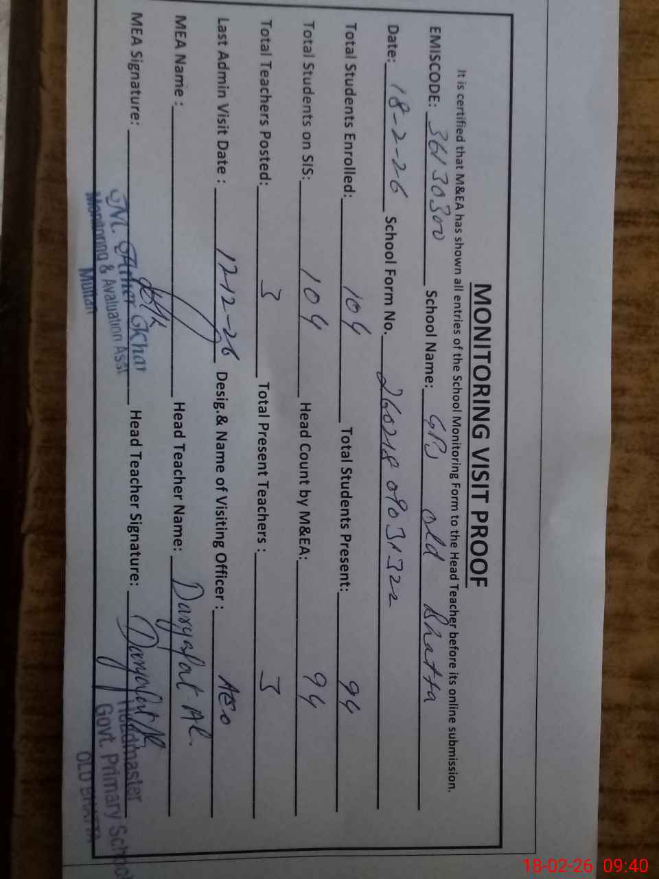 | Certified that this School was Inspected by the Undersigned MEA/DMO Today and the Information Stated Above is as Per Record. | |||||