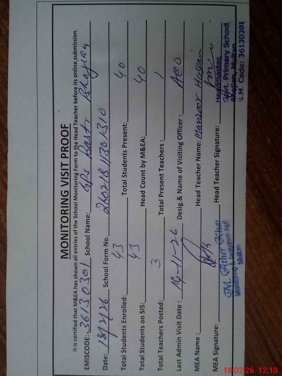 | EMIS Code: 36130301 | Name of School: GPS BASTI BHOJIAN P/O MUKHDOOM RASHID | |||