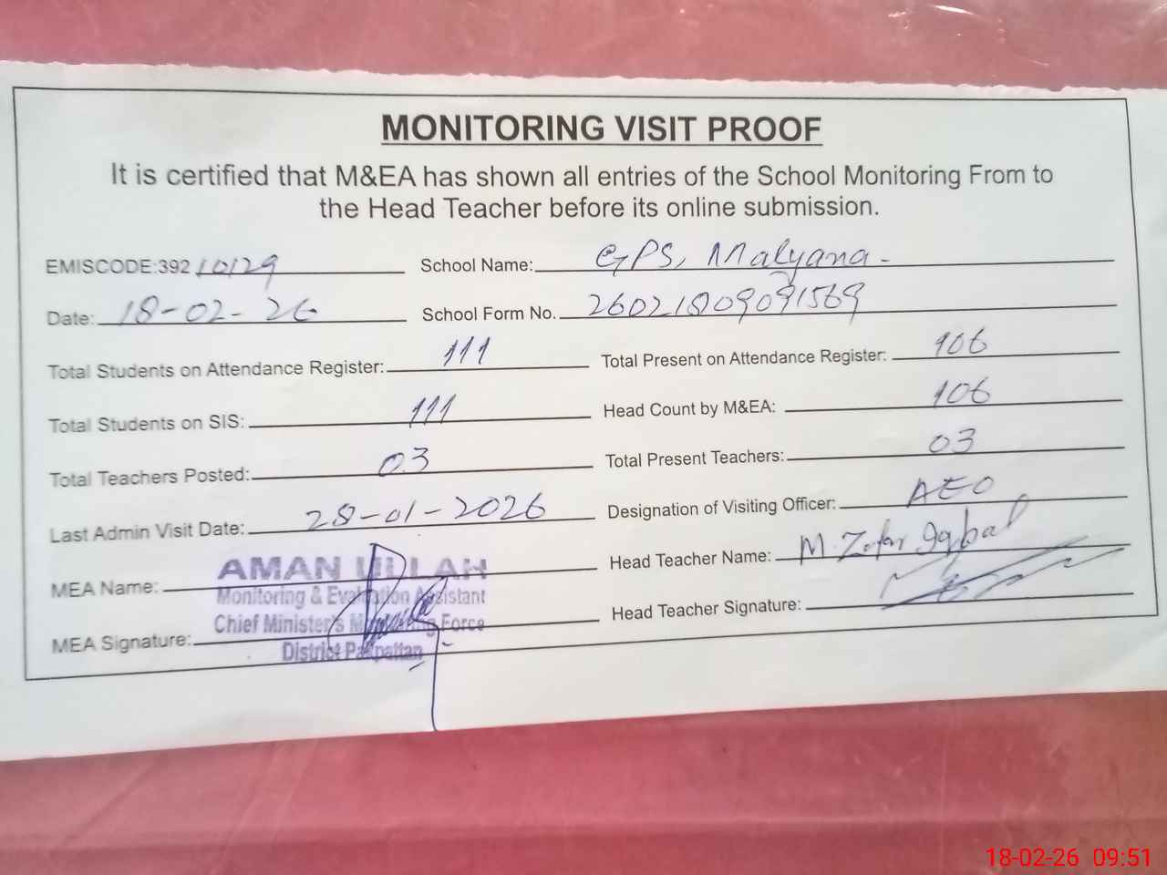 | Attendance Register | Head Teacher | MEA with School | Visit Proof |