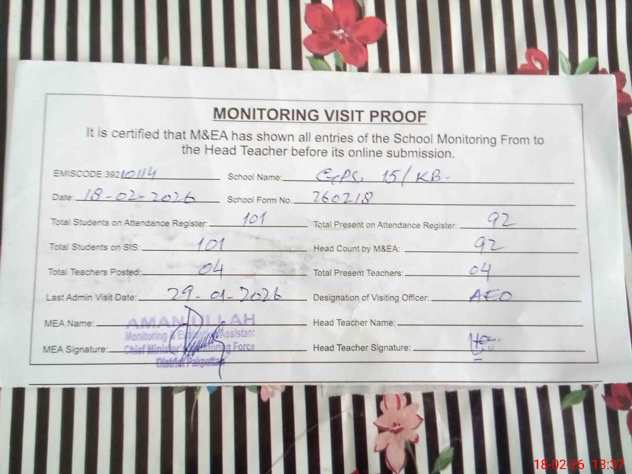 | Attendance Register | Head Teacher | MEA with School | Visit Proof |