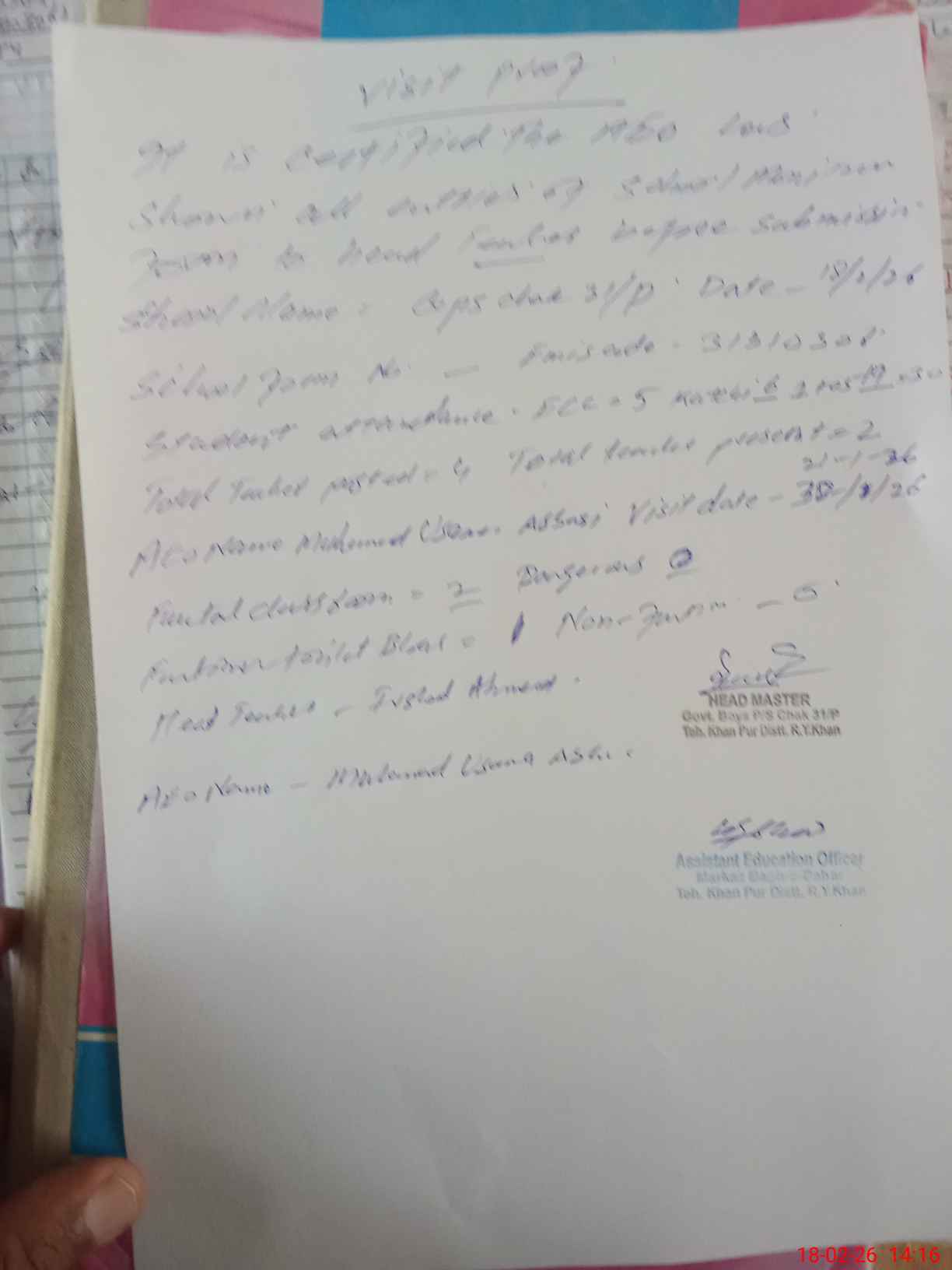 | Name: Ir**** Ah**** Designation: (School Headmaster's/Headmistress's) EST Phone/Cell Number: 03**** |