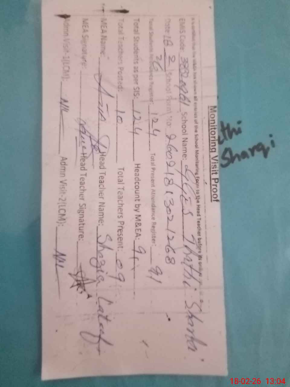 | Attendance Register | Head Teacher | MEA with School | Visit Proof |