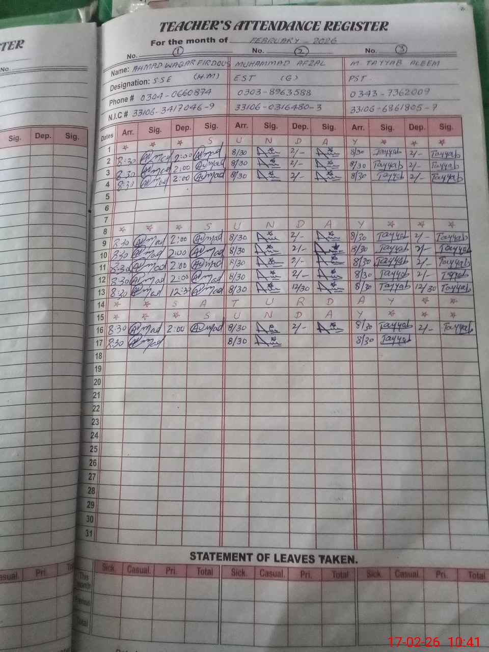 | CNIC | Full Name | Designation | R/C | Absence during last cal. month |