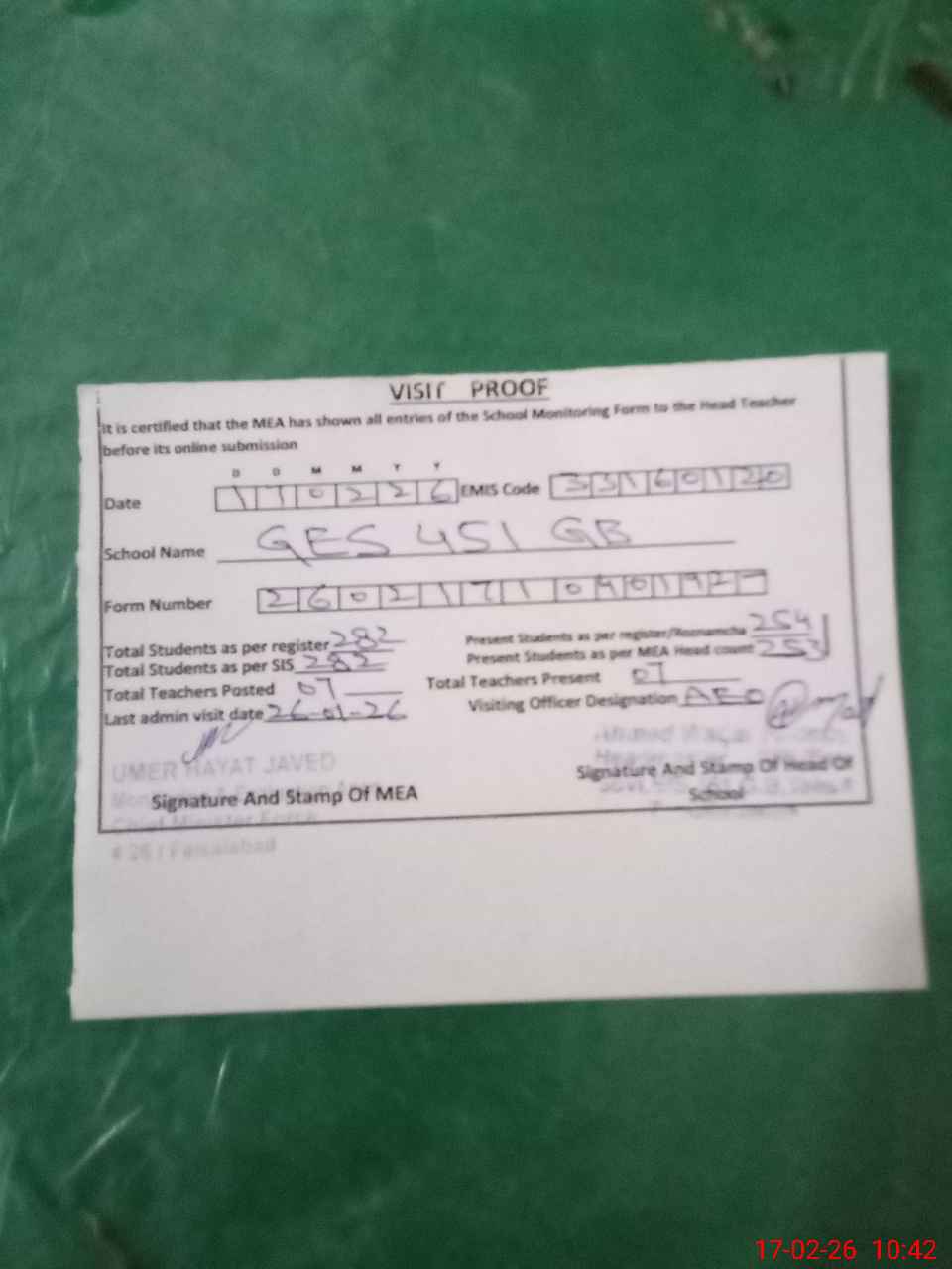 | Attendance Register | Head Teacher | MEA with School | Visit Proof |