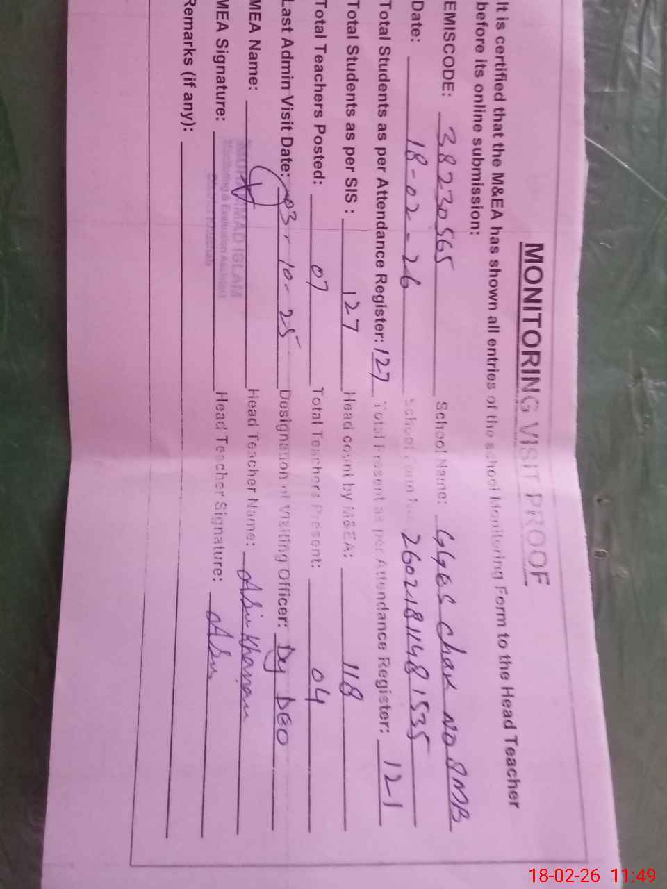 | Remarks (Use Separate Page if Required): Dy DEO visited school on 3 October 2025 students strength on sis 127 | |||||