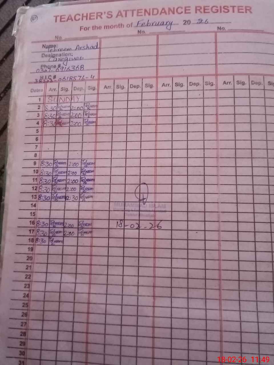 | CNIC | Full Name | Designation | R/C | Absence During Last Calender Month |