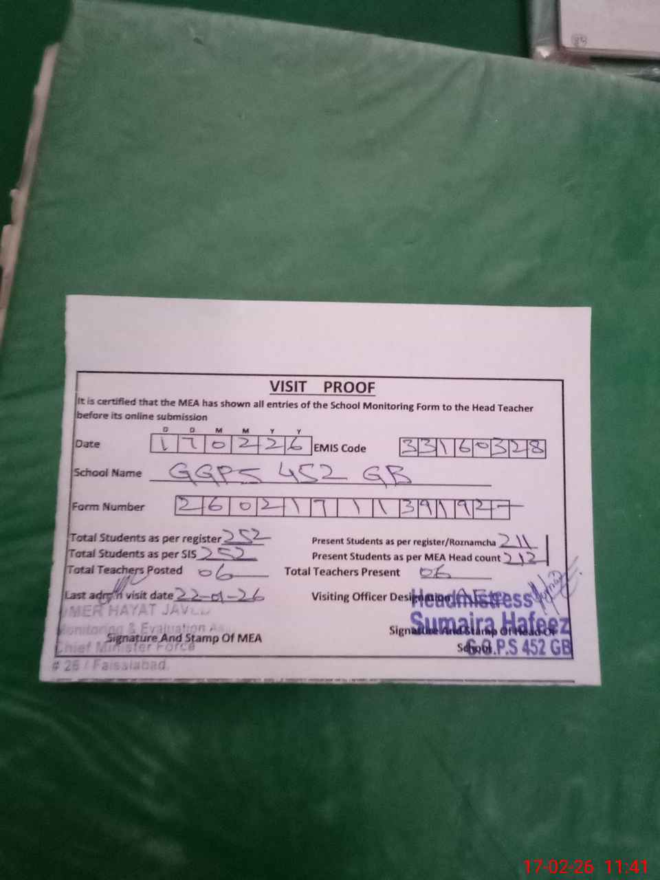 | Certified that this School was Inspected by the Undersigned MEA/DMO Today and the Information Stated Above is as Per Record. | |||||