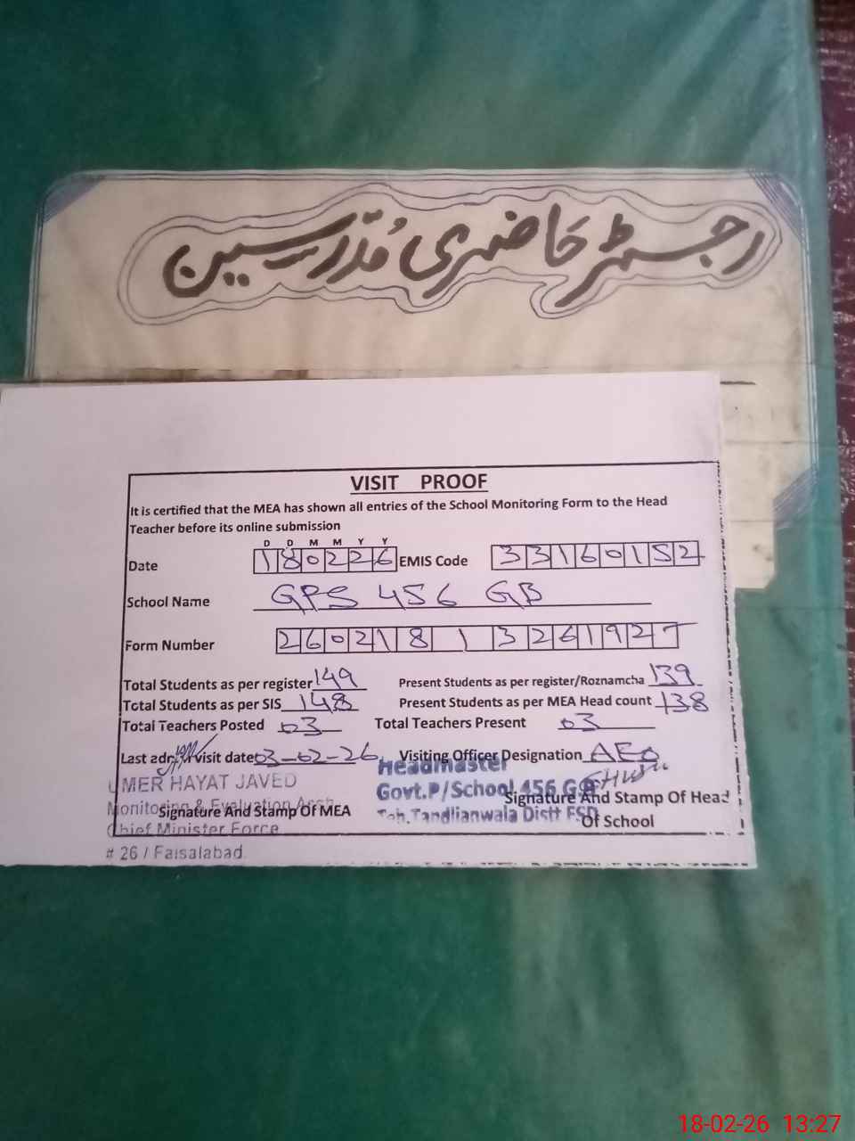 | Attendance Register | Head Teacher | MEA with School | Visit Proof |