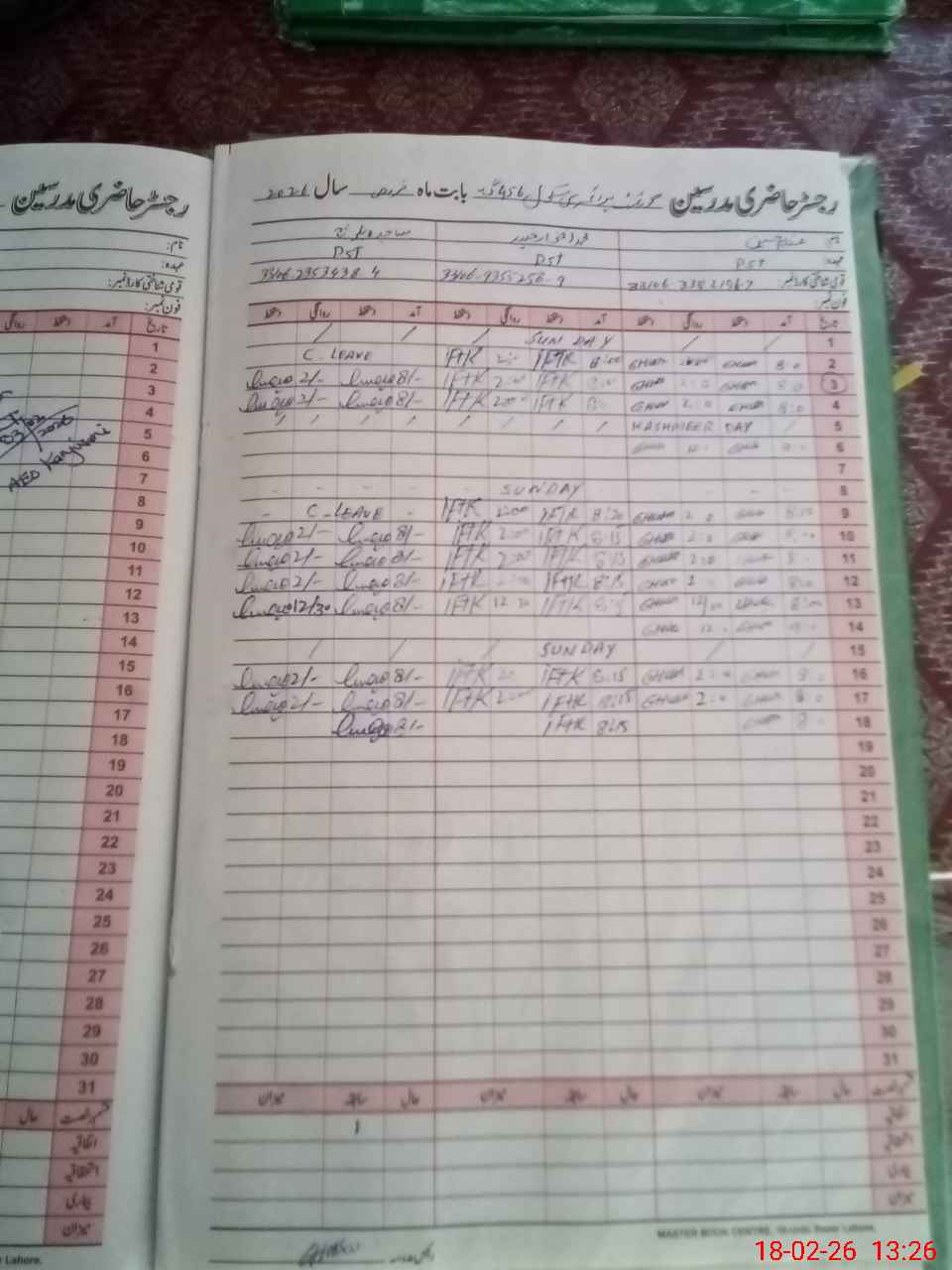 | CNIC | Full Name | Designation | R/C | Absence During Last Calender Month |