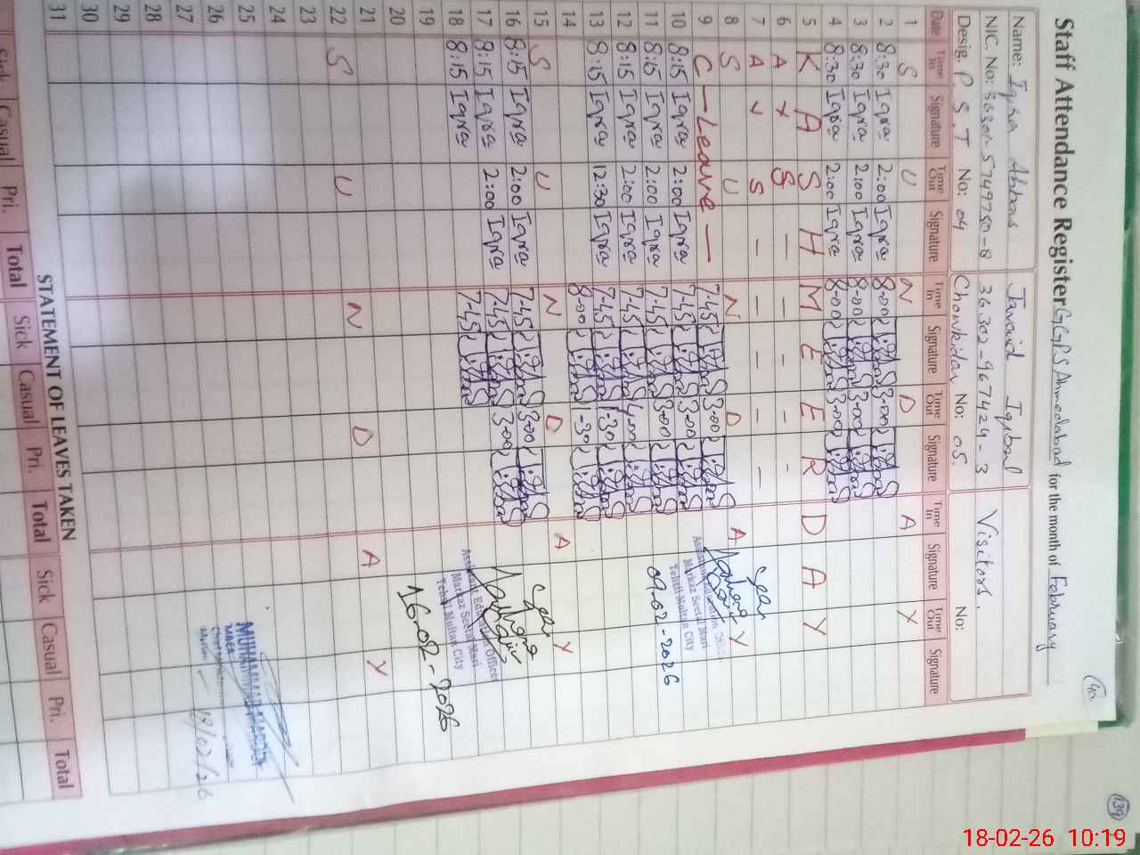 | CNIC | Full Name | Designation | R/C | Absence During Last Calender Month |